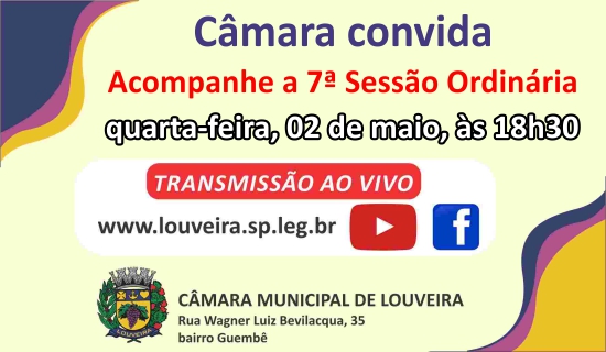 Acompanhe a 7ª Sessão Ordinária da Câmara de Louveira pela transmissão ao vivo no site www.louveira.sp.leg.br