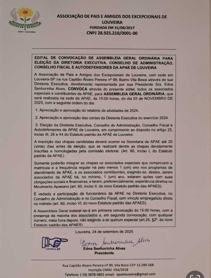 A Associação de Pais e Amigos dos Excepcionais de Louveira, com sede em Louveira-SP na rua Capitão Álvaro Pereira nº 99, Bairro Vila Bossi através de sua Diretoria Executiva, devidamente representada por sua Presidente Sra. Edna Senhorinha Alves, CONVOCA através do presente edital, todos os associados especiais e contribuintes da APAE, para ASSEMBLEIA GERAL ORDINÁRIA, que será realizada na sede da APAE, às 15:00 horas, do dia 03 de NOVEMBRO DE 2025, com a seguinte ordem do dia: