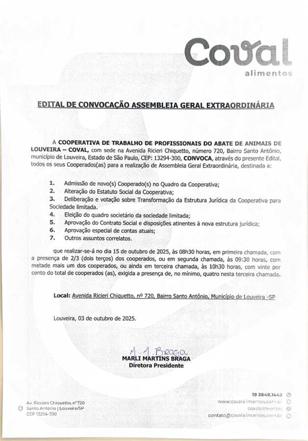 A COOPERATIVA DE TRABALHO DE PROFISSIONAIS DO ABATE DE ANIMAIS DE LOUVEIRA – COVAL, com sede na Avenida Ricieri Chiquetto, número 720, Bairro Santo Antônio, município de Louveira, Estado de São Paulo, CEP: 13294-300, CONVOCA, através do presente Edital, todos os seus Cooperados(as) para a realização de Assembleia Geral Extraordinária, destinada a: