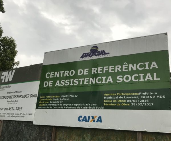 Promessa de campanha para a reeleição do prefeito Junior Finamore (PTB) em 2016, o prédio do Centro de Referência de Assistência Social de LOUVEIRA está com suas obras atrasadas em oitos meses, assim como outras prometidas pela atual gestão. Na placa, em frente ao canteiro da construção, a data de entrega era para ser em fevereiro de 2017, mas até agora os trabalhos não chegaram ao acabamento. Outra promessa de Junior que ‘virou suco’, é a estrutura que seria a sede da Secretaria de Agricultura, o Centro de apoio ao Produtor Rural de LOUVEIRA, e a fábrica de suco e Cooperativa Municipal, que teve seu projeto alterado, e foi entregue no mês passado para abrigar a Secretaria de Cultura. O prédio ficou ‘às moscas’ por quase dois anos.