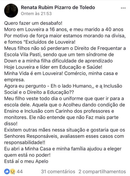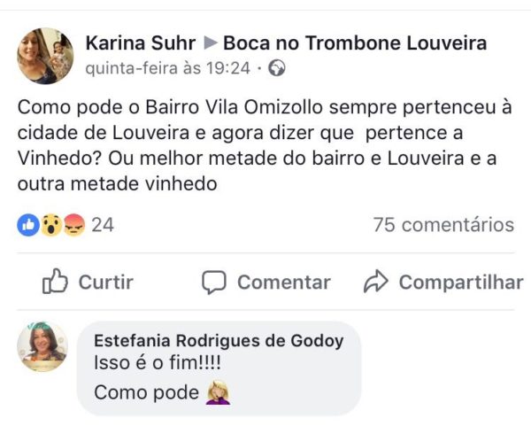 “Tive o cartão cancelado e estou sem ser ser atendida pelo serviço de saúde porque fui considerada moradora do município vizinho, no caso, VINHEDO, já que moro na divisa entre a Vila Omizzolo e esse município”, denuncia Karina Suhr. “A Prefeitura de LOUVEIRA diz que metade da Vila é de de LOUVEIRA e a outra metade de VINHEDO. Mas como? Se até agora todos os meus impostos foram pagos em LOUVEIRA, correspondência, escola, sistema de saúde, tudo sempre foi em LOUVEIRA, como pode mudar de uma hora para outra sem consultar os moradores? O prefeito Finamore não pode tratar as pessoas desse modo cruel e desumano. Não foi para isso que se elegeu. É um absurdo total, um descalabro, total indiferença para com a vida humana”, opina Karina. Já o louveirense Alisson Alagoano, disse em uma rede social que o assunto deveria ter sido discutido antes, em audiências e na Câmara de Vereadores. “As pessoas que moram em áreas de divisa municipal estão com esse problema, e a Prefeitura de LOUVEIRA está cancelando o transporte e o cadastro do tal do cartão cidadão sem avisar. Isso é um assunto que precisa ser discutido na Câmara e providências precisam ser tomadas”, ressaltou.