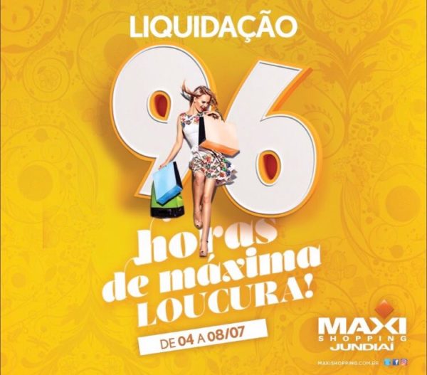 A tão esperada “LIQUIDAÇÃO 96 HORAS DE MÁXIMA LOUCURA” do Maxi Shopping Jundiaí acontece de 4 a 8 de julho oferecendo inúmeros produtos, de vários segmentos, com descontos de até 70%. Nesse período, as lojas organizam promoções para entrar no clima da liquidação que toma conta de todo o Shopping.