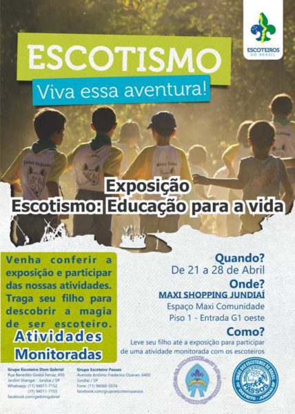 Pela primeira vez em Jundiaí, os Grupos Escoteiros Dom Gabriel e Passos, em parceria com o Maxi Shopping Jundiaí, promovem a ‘Exposição Escotismo: Educação para a vida’.