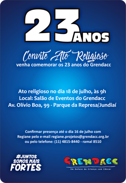 Nesta quarta-feira, dia 18 de julho o Grendacc (Grupo em Defesa da Criança com Câncer) vai completar 23 anos de existência. Para comemorar a data, a instituição está programando um ato religioso que será celebrado na manhã do dia 18, com início às 9 horas, no salão de eventos da instituição – avenida Olívia Boa, 99, Parque da Represa. Toda a comunidade está convidada a participar. Fundado em 18 de julho de 1995, o Grendacc iniciou suas atividades para garantir que o tratamento do câncer na infância pudesse ser feito aqui mesmo na região, perto da casa de cada paciente.
