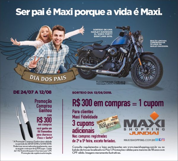 Ser Pai é Maxi porque a Vida é Maxi “: Com esse slogan a Campanha de Dia dos Pais do Maxi Shopping Jundiaí deste ano vai sortear uma Harley-Davidson XL 1200X 0km. E para deixar todo mundo querendo participar, a moto pertence a uma edição limitada e comemorativa do aniversário de 115 anos da Harley-Davidson. Foram produzidas apenas 2.400 unidades no mundo todo, e essa é a de número 1.292 (o número de série foi escrito a mão na lateral do tanque, na fábrica). Realmente um exemplar especial, uma verdadeira raridade.