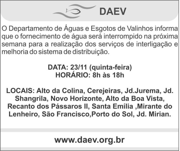 O Departamento de Águas e Esgotos de Valinhos informa que o fornecimento de água será interrompido na próxima semana para a realização dos serviços de interligação e melhoria do sistema de distribuição.