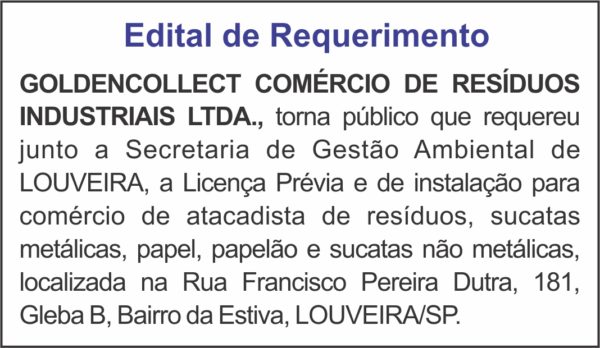 GOLDENCOLLECT COMÉRCIO DE RESÍDUOS INDUSTRIAIS LTDA., torna público que requereu junto a Secretaria de Gestão Ambiental de LOUVEIRA, a Licença Prévia e de instalação para comércio de atacadista de resíduos, sucatas metálicas, papel, papelão e sucatas não metálicas, localizada na Rua Francisco Pereira Dutra, 181, Gleba B, Bairro da Estiva, LOUVEIRA/SP.