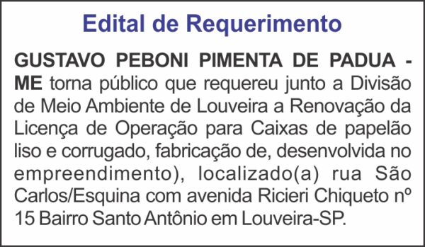 GUSTAVO PEBONI PIMENTA DE PADUA – ME torna público que requereu junto a Divisão de Meio Ambiente de Louveira a Renovação da Licença de Operação para Caixas de papelão liso e corrugado, fabricação de, desenvolvida no empreendimento), localizado(a) rua São Carlos/Esquina com avenida Ricieri Chiqueto nº 15 Bairro Santo Antônio em Louveira-SP.