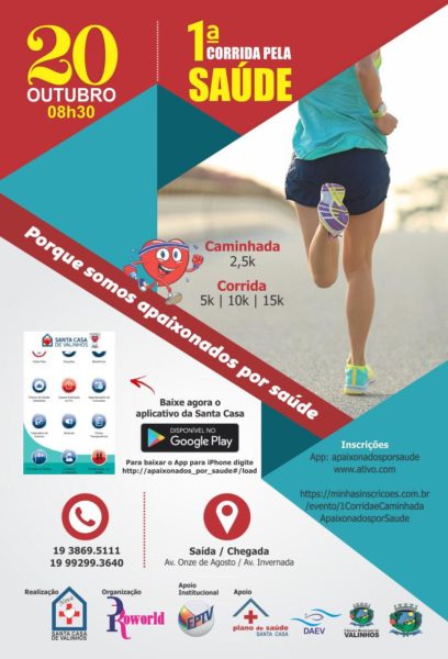 A 1ª corrida “Correndo pela Saúde” já é um sucesso! Várias inscrições começaram a ser feitas e até o dia 20 de outubro, quando ela vai acontecer, a expectativa de ter um recorde de atletas de VALINHOS e região, para participar do evento esportivo e social cujo maior objetivo é conseguir recursos para reforma de sete quartos na UTI adulto e mais anexos na Santa Casa de VALINHOS.