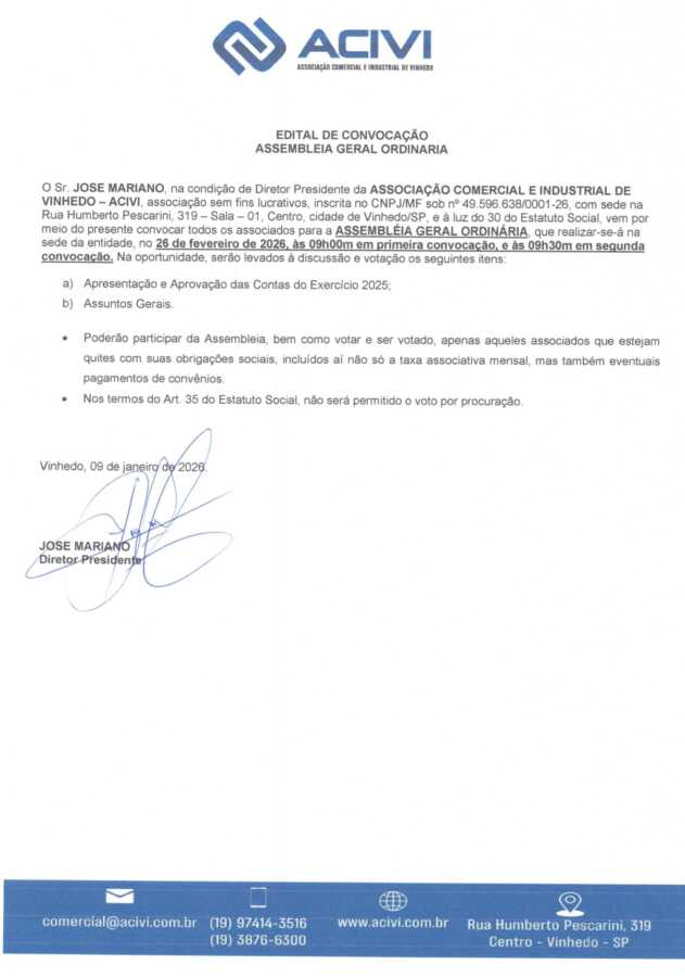 O Sr. JOSE MARIANO, na condição de Diretor Presidente da ASSOCIAÇÃO COMERCIAL E INDUSTRIAL DE VINHEDO – ACIVI, associação sem fins lucrativos, inscrita no CNPJ/MF sob nº 49.596.638/0001-26, com sede na Rua Humberto Pescarini, 319 – Sala 01, Centro, cidade de Vinhedo/SP, e à luz do disposto no Estatuto Social, vem por meio do presente convocar todos os associados para a ASSEMBLEIA GERAL ORDINÁRIA, que realizar-se-á na sede da entidade, no 26 de fevereiro de 2026, às 09h00min em primeira convocação, e às 09h30min em segunda convocação.