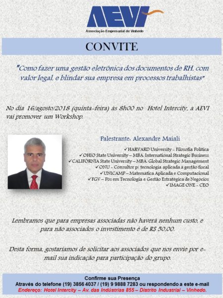 A Associação Empresarial de VINHEDO (Aevi) promove no dia 16 de agosto, a partir das 8h, um workshop para associados e não associados com Alexandre Maiali, renomado consultor da Organização das Nações Unidas (ONU). Ela abordará o tema “Como fazer uma gestão eletrônica dos documentos de RH, com valor legal, e blindar sua empresa em processos trabalhistas”.