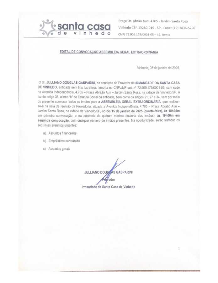 O Sr. JULLIANO DOUGLAS GASPARINI, na condição de Provedor da IRMANDADE DA SANTA CASA DE VINHEDO, entidade sem fins lucrativos, inscrita no CNPJ/MF sob n° 72.909.179/0001-05, com sede na Avenida Independência, 4.705 – Praça Abraão Aun – Jardim Santa Rosa, na cidade de Vinhedo/SP, à luz do artigo 35, alínea “b” do Estatuto Social da entidade, bem como os artigos 21, 27 e 34, vem por meio do presente convocar todos os irmãos para a ASSEMBLEIA GERAL EXTRAORDINÁRIA, que realizar- se-á na sala de reunião da Provedoria, situada a Avenida Independência, 4.705 – Praça Abraão Aun – Jardim Santa Rosa, na cidade de Vinhedo/SP, no dia 15 de janeiro de 2025 (quarta-feira), às 18h30m em primeira convocação, e na ausência do quórum mínimo (maioria dos irmãos), às 19h00m em segunda convocação , com qualquer número de irmãos presentes. Na oportunidade, serão tratados os seguintes assuntos urgentes: a) Assuntos financeiros b ) Empréstimo contratado c) Assuntos gerais