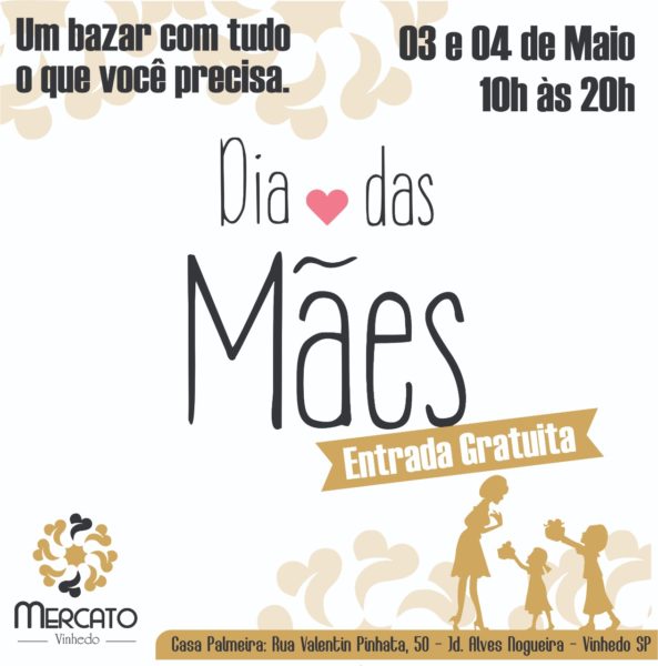 O Dia das Mães está se aproximando e, além de muitos beijos e abraços, e um sincero “Eu te amo, Mãe!”, nada mais prazeroso do que presenteá-la com algo diferente e especial. Pensando nisso, o Mercato VINHEDO preparou um bazar especial do ‘Dia das Mães’.