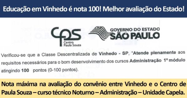 Nota 100, numa escala de 0 a 100. Esta foi a nota máxima concedida pelo Governo do Estado de São Paulo à VINHEDO na parceria entre a Prefeitura e o Centro de Paula Souza. O reconhecimento da excelência em infraestrutura foi oficializado nesta semana em comunicado do Governo do Estado de São Paulo ao prefeito Jaime Cruz. “Mais do que discurso, este é um reconhecimento de que VINHEDO, em nossa gestão, tem investido muito, na prática, em Educação, pilar do desenvolvimento pessoal e profissional. Desde a Educação Infantil, reconhecida pela Fundação Seade como cidade com melhor investimento em Educação para a 1ª Infância; passando pelo Fundamental I e II, com excelentes notas em índices de avaliação como IDEB; o EJA, com oportunidades para estudos aos adultos; e agora o reconhecimento da parceria com curso técnico em Administração, é comprovação de que estamos no caminho certo da gestão pública moderna e que prioriza a Educação, acima de tudo”, comenta o prefeito Jaime Cruz. Na avaliação, repassada pelo Estado, consta que VINHEDO teve nota máxima em todos os quesitos: computadores, internet, software, equipamentos de multimídia, instalações das salas de aula, acervo bibliográfico, qualidade da assistência, alimentação dos alunos, entre outros itens.