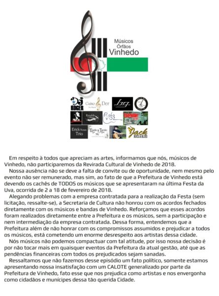 No Manisfesto, alguns músicos (cerca de quarenta) acusam a Prefeitura de VINHEDO ( e não a empresa PMA) de estar aplicando um calote nesses profissionais porque ainda não foram pagos pelo trabalho realizado na Festa da Uva deste ano. Os signatários afirmam que todos os cachês foram acordados com a municipalidade diretamente com músicos e bandas de VINHEDO. E que por esse motivo estarão fora da ‘Revirada Cultural de VINHEDO de 2018′, que é apoiada pelo Governo do Estado de São Paulo, como ato de ‘revolta’ até que os pagamentos sejam efetivados.