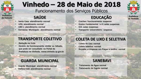 “Responsabilidade, transparência e cautela. São medidas que enfocam nossas ações em VINHEDO, especialmente neste momento de grande indefinição no cenário nacional. Conseguimos estabelecer ações que permitem preservar o funcionamento dos serviços essenciais nesta segunda-feira. E iremos voltar a nos reunir nesta segunda para decidir os encaminhamentos de terça em diante”, afirmou o prefeito Jaime Cruz.