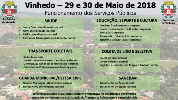 O transporte universitário também estará suspenso terça e quarta-feira, até por conta da suspensão do funcionamento das Universidades e Faculdades. O transporte coletivo também tem redução e permanecerá, nesta terça e ainda na quarta-feira, com os horários de funcionamento equivalente aos de domingo, que podem ser consultados no Portal da Prefeitura de VINHEDO, em www.vinhedo.sp.gov.br, na aba ‘cidadão’, ou ainda pelo link https://goo.gl/p7MQHt . A Prefeitura está atenta às mudanças no cenário das paralisações e poderá emitir novos comunicados à população.