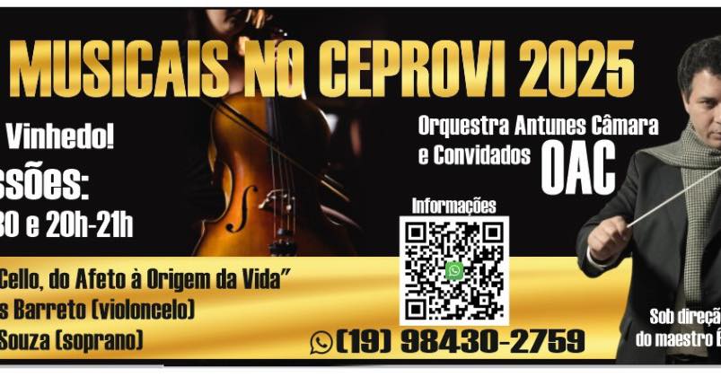 Quem gosta de música clássica não pode perder na próxima quarta-feira (28), no Centro de Educação Profissional de Vinhedo (Ceprovi), as duas primeiras apresentações do projeto “Quartas Musicais”, da Orquestra Antunes Câmara (OAC) e os convidados Raïff Dantas (violoncelo) e Rose de Souza (soprano). As sessões serão das 18h30 às 19h30 e das 20h às 21h e os ingressos já estão à venda. Morador de Vinhedo, o maestro Ênio Antunes, que em 2024 foi diretor musical da turnê do tenor italiano Andrea Bocelli no Brasil, é o responsável pela direção artística do evento.