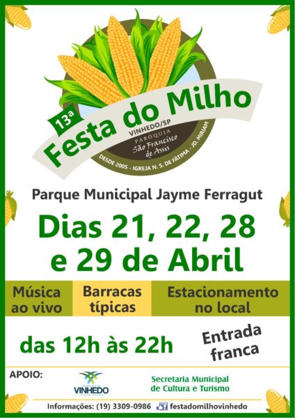 Com apoio da Prefeitura de VINHEDO, por meio da Secretaria de Cultura e Turismo, ocorre a partir de hoje e continua nos dias 22, 28 e 29, a 13ª Edição da Festa do Milho da Paróquia São Francisco de Assis. O tradicional evento será realizado sempre das 12h às 22h no Parque Municipal Jayme Ferragut.