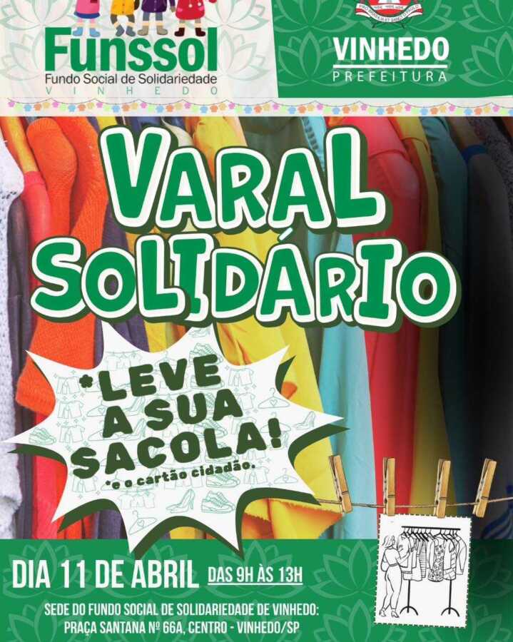 O Fundo Social de Solidariedade de Vinhedo realiza neste sábado (11), mais uma edição do Varal Solidário, iniciativa voltada à distribuição gratuita de itens para famílias em situação de vulnerabilidade social no município. A ação acontecerá das 9h às 13h, na Praça Sant’Ana, nº 66, no Centro.
